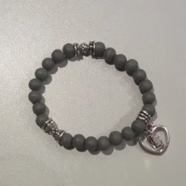 Armband van houten kralen met verzilverde ornamenten. Aan de armband hangt een zilverkleurige hart en het LC embleem. Sluit om de pols door elastisch band. Diameter kraal 8mm.