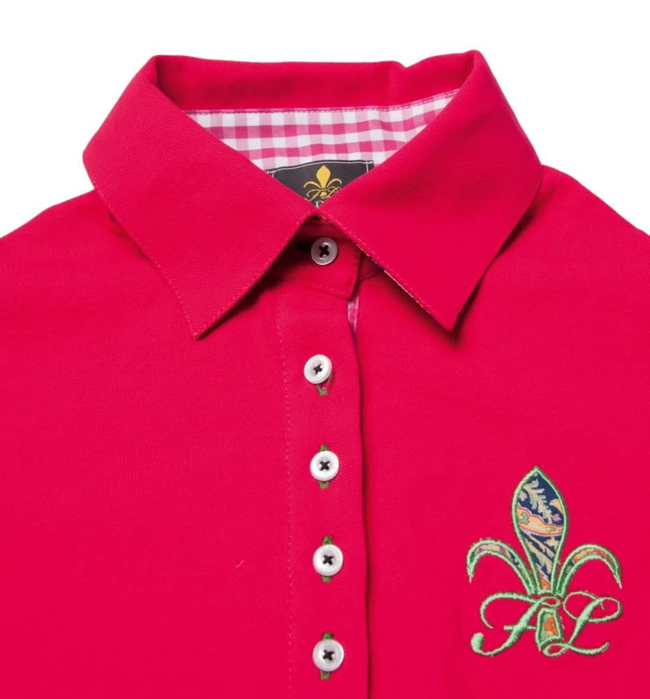 Klassiek piqué poloshirt met prachtige details. De bloemetjesstof op de zoom, de onderste knopenrij en onder de kraag maken een mooi contrast. Het borduursel op de borst bevat dezelfde libertystof.