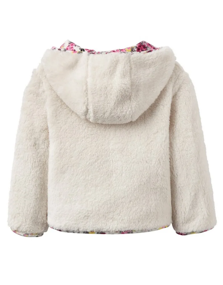 Omkeerbaar fleece-gevoerd sweatshirt. Kleurrijk aan de buitenkant, superzachte teddy aan de binnenkant. Met ritssluiting en capuchon.